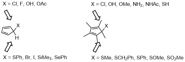 In the asymmetric Diels–Alder reactions, instead of using chiral ligands or chiral auxiliaries to differentiate the side selectivity of the dienolphiles, the differentiation of face selectivity of the dienes (especially for cyclopentadiene derivatives) using stereoelectronic effects have been reported by Woodward since 1955.[17] A systematic research of facial selectivity using substituted cyclopentadiene or permethylcyclopentadiene derivatives have been conducted and the results can be listed as below.[18]