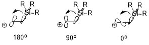 If there is an electropositive substituent (e.g. –SiR3, –SnR3, –HgR, etc.) at the β-position of carbocation, the positive charge could be stabilized which is also due largely to the stereoelectronic effect (illustrated below using –SiR3 as an example). The orientation of the two interacting orbitals can have a significant effect on the stabilization effect (σ(C–Si) → empty p orbital), where antiperiplanar (180°) > perpendicular (90°) > syn (0°).[5]