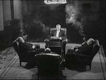 The chapter begins with footage of ducklings, kittens, piglets, and geese.[14] A child then wakes his father for work ironically with no work to do, they laugh and frolic. The factory is shown vacant and still with birds moving in. The children act out what their fathers had done, wheelbarrowing a goat in a mob. The owner is frustrated by orders arriving and the frozen plant. Demands are formulated: an 8-hour work day,[15] fair treatment by the administration,[16] 30% wage increases,[17] and a 6-hour day for minors.[18] The shareholders get involved with the director and read the demands. They discuss dismissively while smoking cigars and having drinks. Presumably on the orders of the shareholders, the police raid the workers,[19] and they sit down to protest. At their meeting the shareholders use the demand letter as a rag to clean up a spill,[20] and a lemon squeezer metaphorically[21] represents the pressure the stockholders intend to apply to the strikers.