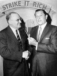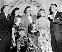 Strike It Rich is a game show that aired on American radio and television from June 29, 1947, to December 27, 1957 on CBS and NBC.[1] People in need of money (such as for medical treatment or a destitute family) appeared and told their tale of woe, then tried to win money by answering four relatively easy questions. Each player would be given $30 and bet any of their bankroll on answering each question after being given the category. If the contestant didn't win any money, the emcee opened the "Heart Line", which was a phone line to viewers who wished to donate to the contestant's family.