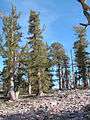 Rocky slopes with Limber and Lodgepole Pines 500 feet (150 m) below the summit