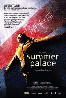 Summer Palace (simplified Chinese: 颐和园; traditional Chinese: 頤和園; pinyin: Yíhé Yuán), is a 2006 Chinese film and the fourth feature film by director Lou Ye. The film was a Chinese-French collaboration produced by Dream Factory, Laurel Films, Fantasy Pictures and Sylvain Bursztejn's Rosem Films. It was made in association with France's Ministère de la Culture et de la Communication, Ministère des Affaires Étrangères and Centre National de la Cinématographie (CNC). The film is the first from mainland China to feature the full-frontal adult nudity of both its male and female leads,[1] though earlier films such as Xiao Wu (1998),[2] Lan Yu (2001),[3] Green Hat (2003),[4] and Star Appeal (2004),[5] have featured full-frontal adult male nudity.