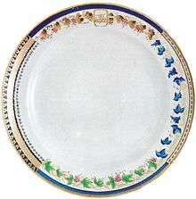Hand painted Chinese porcelain dinner wares became the height of fashion in Europe and North America during the 18th century as a way showing off wealth and status in society.[1] The porcelain was ordered through different East India Companies and later independent American traders;[2] all Western trading companies with ships sailing to China.[2] The porcelain was decorated with a combination of Chinese patterns and Western motifs selected by its commissioner. The Chinese manufacturers sent porcelain samples of decorations to their prospective clients in Europe and the United States and their clients provided the porcelain painters in China with paintings, drawings or sketches for their orders.[3] These dinner wares are categorized into familles (French for "families") mainly by the colors they are painted in such as famille verte, noire, jaune and rose.[4]