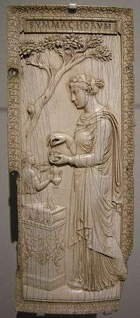 The Symmachi–Nicomachi diptych is a Late Antique ivory diptych dating to the late fourth or early fifth century[1] whose panels depict scenes of ritual pagan religious practices. Both its style and its content reflect a short-lived revival of traditional Roman religion and Classicism at a time when the Roman world was increasingly turning to Christianity and rejecting the Classical tradition. The diptych takes its name from the inscriptions "Nicomachorum" and Symmachorum," references to two prominent Senatorial families. It was commissioned by the family of Q. Aurelius Symmachus, "one of the paladins of the pagan cause in the last quarter of the fourth century".[2]