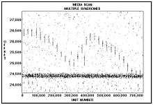 One of the earliest uses of 2D Error Mapping was applied to the recorded errors from a transverse-scan digital tape recording device made by Ampex Corporation. The accompanying Media Scan image demonstrates that error locations are key to recognizing that multiple error-producing syndromes are occurring simultaneously and affecting the total bit error rate experienced during the test recording session.