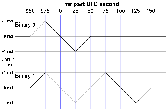 One signal element consists of the phase of the carrier shifted linearly by +1 rad in 25 ms (known as "ramp A"), then shifted linearly by −2 rad over 50 ms ("ramp B"), then shifted linearly again by +1 rad for another 25 ms ("ramp C"), returning the phase to zero. One signal element is always sent at each second between 0 and 58. Two signal elements are sent in sequence to represent a binary one; otherwise it is interpreted as binary zero. During ramp B of the initial signal element, the exact point the signal phase is at zero represents the top of the UTC second. Since the phase is the integral of the frequency, this triangular phase modulation at 40 rad/s corresponds to a square frequency modulation with a deviation of 20/π ≈ 6.37 Hz.