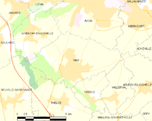 General Falkenhausen, commander of the 6th Army arranged his infantry in the Arras area according to Loßberg and Hoen's preference for a rigid defence of the front-line, supported by methodical counter-attacks (Gegenangriffe), by the "relief" divisions (Ablösungsdivisionen) on the second or third day. Five Ablösungsdivisionen were placed behind Douai, 15 miles (24 km) away from the front line.[26] The new Hindenburg line ended at Telegraph Hill between Neuville-Vitasse and Tilloy lez Mofflaines, from whence the original system of four lines 75–150 yards (69–137 m) apart, ran north to the Neuville St. Vaast–Bailleul road. About 3 miles (4.8 km) behind, were the Wancourt–Feuchy and to the north the Point du Jour lines, running from the Scarpe river north along the east slope of Vimy ridge. The new Wotan line, which extended the Hindenburg position, was built around 4 miles (6.4 km) further back and not entirely mapped by the Allies until the battle had begun.[27]