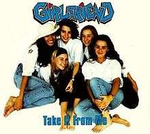 "Take It From Me" is the 1992 debut dance-pop track recorded by the Australian act Girlfriend. The track, taken from the debut album Make It Come True, reached number one on 17 June 1992 (where it spent 2 weeks during its 17-week run) and would be the quintet's only number one and top five single in Australia.[1] It also reached number 47 in the UK, also in 1992.