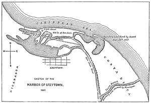 According to the Cañas-Jerez Treaty of 1858, as reaffirmed and interpreted by the arbitration of U.S. president Grover Cleveland in 1888 and by the judgment of the Central American Court of Justice in 1916 , the border between Nicaragua and Costa Rica runs along the right bank of the San Juan River, from its mouth in the Caribbean port of San Juan del Norte (formerly known as Greytown), to a point located three miles downstream from an old fortification known as Castillo Viejo ("Old Castle"), originally built to guard the access to Lake Nicaragua.[9]