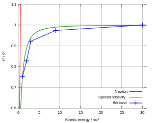 - ↑ Bertozzi, William (1964), "Speed and Kinetic Energy of Relativistic Electrons", American Journal of Physics, 32 (7): 551–555, Bibcode:1964AmJPh..32..551B, doi:10.1119/1.1970770