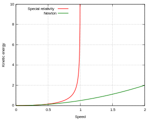 where . So relativistic energy and momentum significantly increase with speed, thus the speed of light cannot be reached by massive particles. In some relativity textbooks, the so-called "relativistic mass" is used as well. However, this concept is considered disadvantageous by many authors, instead the expressions of relativistic energy and momentum should be used to express the velocity dependence in relativity, which provide the same experimental predictions.