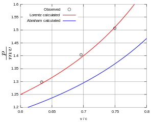 Electrons traveling between 0.25–0.75c indicated an increase of momentum in agreement with the relativistic predictions, and were considered as clear confirmations of special relativity. However, it was later pointed out that although the experiments were in agreement with relativity, the precision wasn't sufficient to rule out competing models of the electron, such as the one of Max Abraham.[3][4]