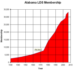 As of December 31, 2011, The Church of Jesus Christ of Latter-day Saints reported 34,725 members, six stakes, 75 Congregations (42 wards,[1] 33 branches[1]), one mission, and one temple in Alabama.[2]