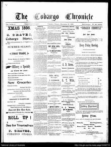 The Cobargo Chronicle was a weekly[1] newspaper first published on 18 November 1898 by William Boot in Cobargo[2] New South Wales. The newspaper was originally titled The Cobargo Chronicle and South Coast Journal and was devoted to "...the interests of the Dairying, Mining and Agricultural industries established in the large and populous district in which it circulates...".[3] Subscriptions were priced at one pound per annum[3] and the paper was printed Friday mornings from the offices situated on Moruya Road, Cobargo.[3]