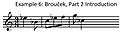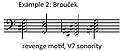 The smallest building block of Janáček’s later music, including this opera, is the motif. His definition is different from, and probably stricter than, what most music scholars might consider as a definition of a motif. Janáček’s motifs have a clear beginning and end, and the dynamic is constant throughout the short group of, perhaps, three to five notes. The note values must be equal, and a motif may begin on any beat, but may not end on a downbeat. Janáček’s methods of alteration of a motif are varied, but no matter what he does to the melody, the harmony, key, tempo, mode, register, or any of the contextual material, the rhythm remains unaltered, thereby, in his opinion, maintaining the original motif as a recognizable entity.[12] Example 1 (see Musical examples below) shows a motif from Brouček and illustrates some alterations of the same motif. Example 2 is another motif used in the opera. Janáček often employs short musical phrases that extend beyond his unique definition of a motif, creating what Cooper calls a motive.[12]
