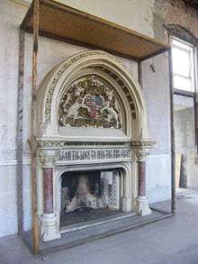 Adjoining the bar area is the banqueting hall - completed in October 1869 by Edward Pugin. The centre-piece of the hall is a massive fireplace inscribed with the motto Pile on the logs to make the fire great. The fireplace is still in situ and cost over £250 in 1869.[17] The hall has a segmented ceiling, and the floorboards are laid with New Zealand pine. The banquet hall is listed on The Ramsgate Society's Buildings at Risk Register.[18]