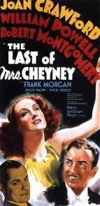 The Last of Mrs. Cheyney (1937) is a drama/comedy motion picture starring Joan Crawford, William Powell, Robert Montgomery and Frank Morgan. The film tells the story of a chic jewel thief in England, who falls in love with one of her marks.