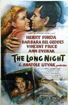 The Long Night is a 1947 American film noir directed by Anatole Litvak and produced by RKO. It is a remake of Le Jour Se Lève (1939) by Marcel Carné. The drama stars Henry Fonda, Barbara Bel Geddes, Vincent Price and Ann Dvorak.[2] The title of the original French film is an idiom which translates roughly as "dawn is breaking".