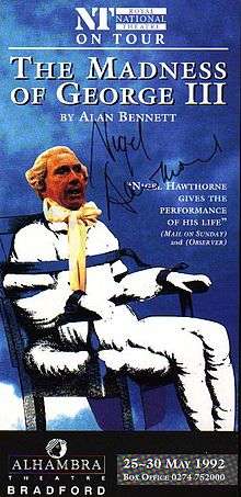 The play has been viewed as a character study for the actor who plays George III and most reviewers attribute its success to compelling performances from the two actors, Hawthorne and Haig, who played the king. Frank Rich of the New York Times singled out Nigel Hawthorne's performance in the US tour calling it "astonishing" and "unforgettable", though he labelled the play itself as not "one of Bennett's major works" and as being more "marketable to Broadway and the colonies".[3] Writing about the 2012 revival, Lyn Gardner said that Luscombe's production reminds us that "Bennett is not writing a royal Downton Abbey, but a play exploring appearance and reality", and that the play brings out the fact that amidst all the royal pomp the king is merely a man like everybody else.[4] In The Telegraph, Charles Spencer praised Haig's performance, comparing it favorably to Hawthorne's performance twenty years earlier, saying "it seemed an impossible act to follow, but David Haig proves every inch Hawthorne’s equal in a performance of extraordinary emotion, tenderness and humour".[5]