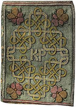 The second book is smaller than the first, only 5¾" by 4", and is also bound in canvas. The background is red silk worked in a similar stitching method to the Miroir cover. Most of the design is a large monogram in blue silk and silver thread that contains the letters K, A, F, H, and R. The K refers to Katherine and the other letters probably signify Latin initials for rulership (actual or claimed) of England, France and Ireland. Like the first book, heartsease flowers decorate the corners. The back cover is worn beyond recognition.[1]
