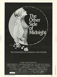 The Other Side of Midnight is a 1977 American drama film directed by Charles Jarrott and starring Marie-France Pisier, John Beck and Susan Sarandon. Herman Raucher wrote the screenplay based on Sidney Sheldon's 1973 novel of the same name.