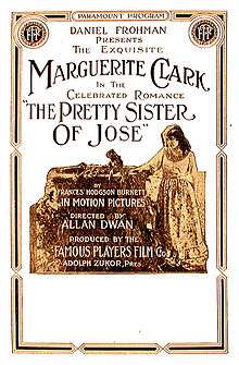 The Pretty Sister of Jose was a 1915 American silent romantic drama written and directed by Allan Dwan, and distributed by Paramount Pictures. Based on Frances Hodgson Burnett's 1889 novel of the same name and the 1903 stage play starring Maude Adams, the film starred Marguerite Clark and Jack Pickford.[1] The Pretty Sister of Jose is now presumed lost.[2][3]