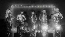 For their variety show The Girls Aloud Party, which aired between The X Factor's finale and its results show on 13 December, Girls Aloud wore tight silver fishtail dresses.[58] The outfits were compared to those of Diana Ross in the 1960s, as well as the movie musical Dreamgirls.[59] At the 2009 BRIT Awards, Girls Aloud performed in sleeveless sequined leotards. Accompanied by male dancers in white suits, the group performed a routine involving pink feather fans, giving the illusion of nudity until they emerged from behind the fans.[60] The performance was nominated for Most Memorable Performance the following year at the 2010 BRIT Awards.[61]