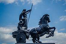 Thornycroft also worked on a monumental representation of Boadicea and Her Daughters,[2] exhibiting a "Colossal head of Boadicea, a part of a chariot group now in progress" in 1864.[9] A short biography published that year said he had already been working on it for many years "at intervals".[3] The sculpture was not, however, cast in bronze until 1902, 17 years after his death.[2] when it was installed on plinth on the Victoria Embankment, by Westminster Bridge, London.[10] The figures are shown in a chariot with scythed wheels, drawn by two horses.[10]