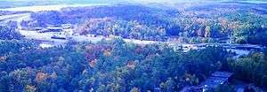 Thousand Islands Border Crossing, as seen in 2003 from the 1000 Islands Tower. The US border station is on the left. | |