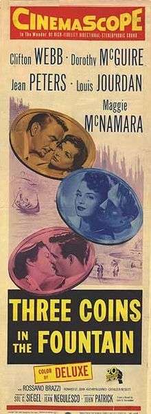 Three Coins in the Fountain is a 1954 American romantic comedy film directed by Jean Negulesco and starring Clifton Webb, Dorothy McGuire, Jean Peters, Louis Jourdan, Rossano Brazzi, and Maggie McNamara. Written by John Patrick, the film is about three American women working in Rome who dream of finding romance in the Eternal City.[4]