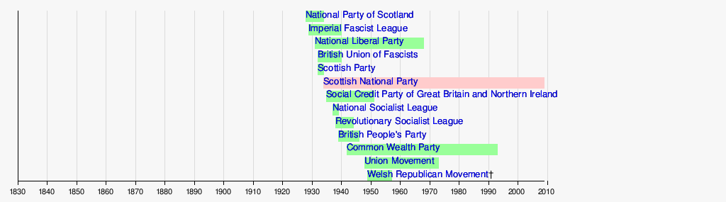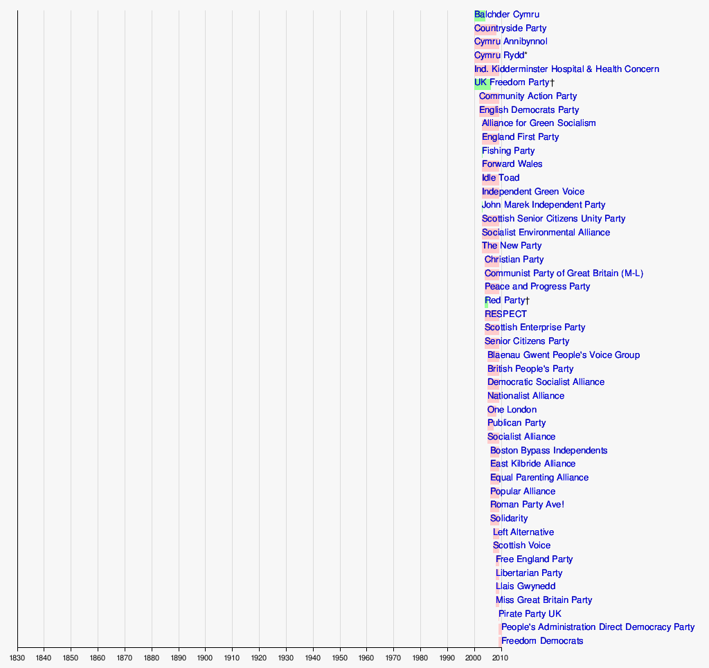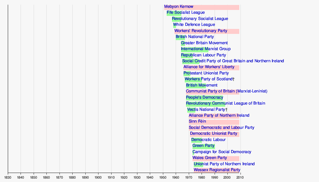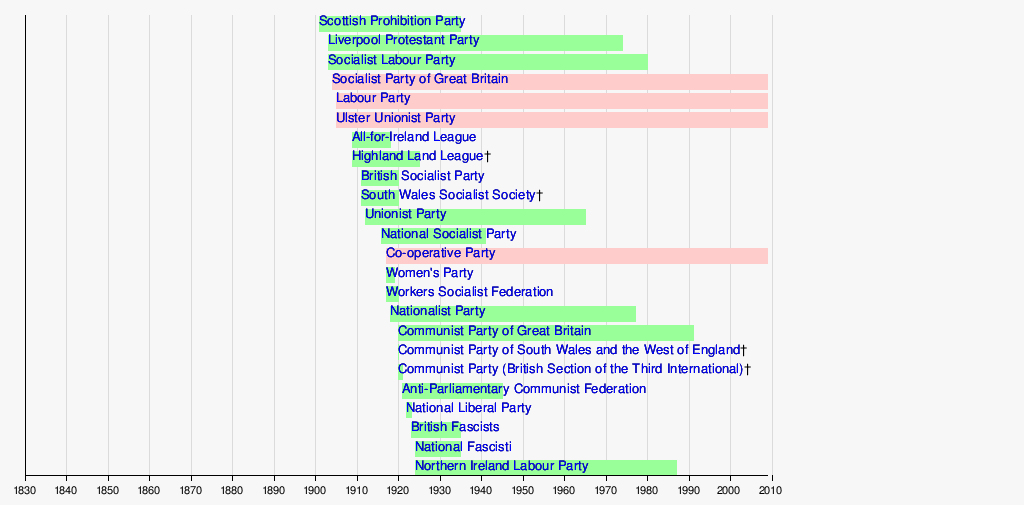The following timeline of political parties in the United Kingdom shows the period during which various parties were active, from their date of establishment to their date of dissolution. Defunct parties are shown in green, and currently active parties are shown in pink. An asterisk or dagger indicates that the exact year of establishment or dissolution, respectively, is not certain. Where a party has changed its name over the course of its existence, only the most recent name is given.