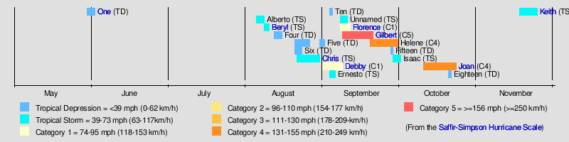 The 1988 Atlantic hurricane season was an active season during which twelve tropical cyclones formed. The season officially began on June 1, 1988 and ended November 30, 1988, the dates which conventionally limit the period of each year when tropical cyclones tend to form in the Atlantic. This timeline documents tropical cyclone formations, strengthening, weakening, landfalls, extratropical transitions, as well as dissipations during the season. The timeline also includes information which was not operationally released, meaning that information from post-storm reviews by the National Hurricane Center, such as information on a storm that was not operationally warned upon. This season produced 19 tropical depressions, of which 12 became named storms; 5 attained hurricane status, of which 3 became a major hurricane, a storm that ranks as a Category 3 or higher on the Saffir-Simpson Hurricane Scale. The most notable storm in 1988 was Hurricane Gilbert, which was at the time the most intense hurricane in the Atlantic on record. Hurricane Gilbert caused about $5 billion in damage and 300 fatalities. The other notable storm was Hurricane Joan, which struck Nicaragua as a category 4 hurricane, and caused about $2 billion in damage and about 200 fatalities. Joan crossed into the Pacific and was renamed Miriam. Both Gilbert and Joan were retired by the World Meteorological Organization in the spring of 1989 and were replaced by Gordon and Joyce in 1994.