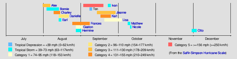 Hurricane Ivan Tropical Storm Otto (2004) Subtropical Storm Nicole (2004) Tropical Storm Matthew (2004) Hurricane Lisa (2004) Hurricane Karl (2004) Hurricane Jeanne Tropical Storm Hermine (2004) Hurricane Gaston (2004) Hurricane Frances Tropical Storm Earl (2004) Hurricane Danielle (2004) Hurricane Charley Tropical Storm Bonnie (2004) Hurricane Alex (2004) Saffir-Simpson Hurricane Scale