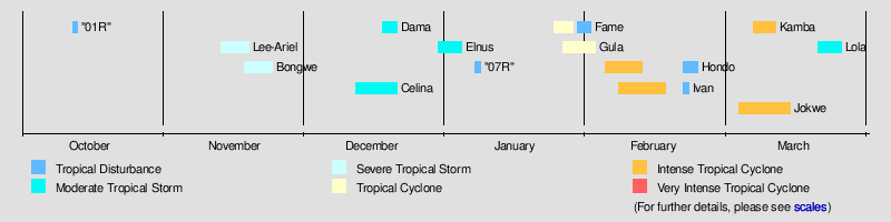Below is a timeline of the 2007-08 South-West Indian Ocean cyclone season, documenting all the storm formations, strengthening, weakening, landfalls, extratropical transitions, as well as dissipation.