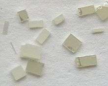 Titanium dioxide is the most widely used white pigment because of its brightness and very high refractive index, in which it is surpassed only by a few other materials. Approximately 4.6 million tons of pigmentary TiO2 are used annually worldwide, and this number is expected to increase as utilization continues to rise.[33] When deposited as a thin film, its refractive index and colour make it an excellent reflective optical coating for dielectric mirrors and some gemstones like "mystic fire topaz". TiO2 is also an effective opacifier in powder form, where it is employed as a pigment to provide whiteness and opacity to products such as paints, coatings, plastics, papers, inks, foods, medicines (i.e. pills and tablets) as well as most toothpastes. In paint, it is often referred to offhandedly as "the perfect white", "the whitest white", or other similar terms. Opacity is improved by optimal sizing of the titanium dioxide particles. Some grades of titanium based pigments as used in sparkly paints, plastics, finishes and pearlescent cosmetics are man-made pigments whose particles have two or more layers of various oxides – often titanium dioxide, iron oxide or alumina – in order to have glittering, iridescent and or pearlescent effects similar to crushed mica or guanine-based products. In addition to these effects a limited colour change is possible in certain formulations depending on how and at which angle the finished product is illuminated and the thickness of the oxide layer in the pigment particle; one or more colours appear by reflection while the other tones appear due to interference of the transparent titanium dioxide layers.[34] In some products, the layer of titanium dioxide is grown in conjunction with iron oxide by calcination of titanium salts (sulfates, chlorates) around 800 °C[35] or other industrial deposition methods such as chemical vapour deposition on substrates such as mica platelets or even silicon dioxide crystal platelets of no more than 50 µm in diameter.[36] The iridescent effect in these titanium oxide particles (which are only partly natural) is unlike the opaque effect obtained with usual ground titanium oxide pigment obtained by mining, in which case only a certain diameter of the particle is considered and the effect is due only to scattering.