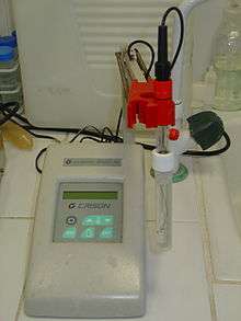 - pH meter: A potentiometer with an electrode whose potential depends on the amount of H+ ion present in the solution. (This is an example of an ion-selective electrode.) The pH of the solution is measured throughout the titration, more accurately than with an indicator; at the endpoint there will be a sudden change in the measured pH.