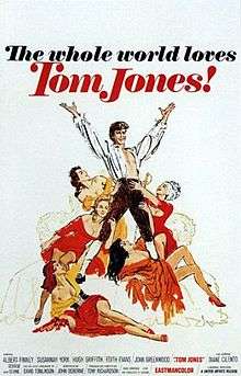 Tom Jones is a 1963 British adventure comedy film, an adaptation of Henry Fielding's classic novel The History of Tom Jones, a Foundling (1749), starring Albert Finney as the titular hero. It was one of the most critically acclaimed and popular comedies of its time,[2] winning four Academy Awards, including Best Picture. The film was directed by Tony Richardson and the screenplay was adapted by playwright John Osborne. The film is notable for its unusual comic style: the opening sequence is performed in the style of a silent film, and characters sometimes break the fourth wall, often by looking directly into the camera and addressing the audience, and going so far as to have the character of Tom Jones suddenly appearing to notice the camera and covering the lens with his hat.
