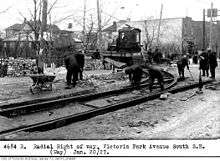 On August 16, 1922, the City of Toronto formally acquired the T&YRR lines. The plan was that the city portions of the T&YRR radial lines would be incorporated into the TTC, and the portions outside the city would be managed by Ontario Hydro as the Hydro-Electric Railways: Toronto and York Division. Thus, the Toronto streetcar system replaced the radial line between Queen Street and Victoria Park Avenue, making the latter street the western terminal of the radial line.[6]