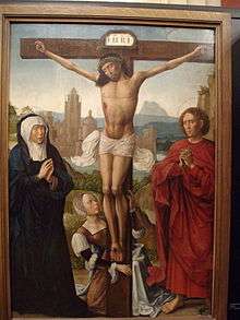 Though in the Middle Ages, the crucifixion of Christ typically depicted four nails, beginning in the thirteenth century, some Western art began to represent Christ on the cross with his feet placed one over the other and pierced with single nail.[1] The poem Christus patiens attributed to St. Gregory Nazianzus and the writings of Nonnus and Socrates of Constantinople also speak of three nails.[1]