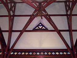 The interior features wooden beams that form an intricate complex of transverse and rib vaulting. They resemble medieval roof timbering. Trimmed in vermillion, the beams are fastened together by gold star-shaped bolts. The main nave is divided from the side naves by wooden columns that are connected by wooden arches in the same style as the ceiling beams. The chancel and apse ceiling is painted in terra-cotta and features stenciling in gold leaf. The rest of the cathedral's décor is rather plain with white plastered walls above dark wood wainscoting. Nineteenth century stained glass windows illuminate the interior of the church. The Stations of the Cross on the side walls are later additions.