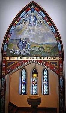 The baptistery mural, "The Angels Appearing to the Shepherds" (1929)(designed by John Wesley Little and completed by S.R. Hartman after Little's death) was restored by Michele W. Mapstone in 2009.
