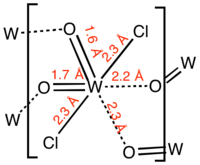 The compound is a polymer consisting of distorted octahedral W centres. The monomer is characterized by two short W-O distances, typical for a multiple W-O bond, and two long W-O distances more typical of a single or datice W-O bond.[3]