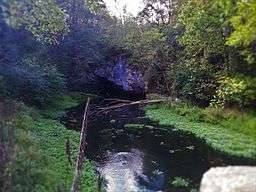 - "a rude arch of stone hanging over it, forms a passage for the water, which it throws out with some degree of violence, and in such plenty as to form a fine stream, which at length buries itself again in the bowels of the earth."