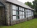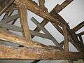 The end gables were replaced in stone, probably in the 18th century with side walls that are 3-panel high timber-framing, infilled originally with brick nogging, resting on a plinth of rubble stonework. To the north side the timber-framing is largely intact, but to the south, much of the timber-framing has had to be replaced. Timbers at the upper end show signs of smoke blackening, indicating that it was formerly a house. Mortices survive for wind-braces – two to each bay. The matching ‘blades’ of each cruck truss are sawn on only one surface, with the other surface curved. This is a result of the vertical separation of the matching curved branch that formed the cruck, after being cut from a tree..