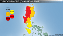 Typhoon Chan-hom, known in the Philippines as Typhoon Emong, is the sixth tropical depression and the second tropical storm to develop during the 2009 Pacific typhoon season. Chan-hom developed out of an area of convectional cloudiness associated with an area of disturbed weather which originated from the remnants of Tropical Depression Crising and formed southeast of Nha Trang, Vietnam on May 2. Moving towards the northeast, it slowly organized according to JTWC who issued a TCFA, and JMA classified Chan-hom as a minor tropical depression later that day. The next day, both JTWC and JMA upgraded the depression to a tropical storm and named it Chan-hom. On May 6, the storm intensified into a Category 1 typhoon, and on May 7, Chan-hom intensified into a Category 2 typhoon equivalent. However, Chan-hom weakened into a severe tropical storm after passing northern Luzon. On May 14, Chan-hom regenerated into a Tropical Depression, and dissipated late on May 15. Laos submitted the name, which means a kind of tree.