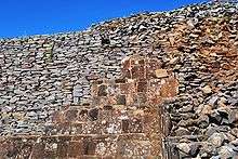 At the front of the platform, facing out towards Lake Pátzcuaro, are five yácata pyramids in a row roughly from north to south. Unlike Aztec or Mayan pyramids, these structures are rounded, not square. The five structures are roughly keyhole shaped, linked together at the back by stepped pyramidal platforms. The core of each of these structures is piled-up rubble which was then faced with stone slabs decorated with spirals, circles and other geometric designs and petroglyphs.[2] These fitted stone slabs are similar to the masonry used by the Incas in South America. Another distinction of this and other Purépecha architecture is that no indication of stucco has ever been found.[1][3]