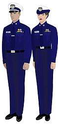 The uniforms of the United States Coast Guard Auxiliary serve to distinguish Auxiliarists from members of other civilian auxiliaries and of other armed services. Auxiliarists are expected to wear a uniform intended for the situation and mission.[1] Each auxiliary uniform is identical to a Coast Guard officer's military uniform, with the exception that the buttons and stripes on dress jackets and shoulder boards are silver in color, rather than gold. On dress uniforms, appointed staff officers wear insignia with a red "A" and elected officers wear insignia with a blue "A", while black "A"s are worn on insignia by both elected and appointed officers on the ODU uniform. Auxiliarists are expected to adhere to the same rules of correct uniform wear as regular Coast Guard officers. When augmenting Coast Guard personnel, the military-style insignia of Auxiliary position is generally removed and the organizational insignia is worn.