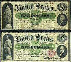 Apart from taxes, the second major source of income was government bonds. For the first time bonds in small denominations were sold directly to the people, with publicity and patriotism as key factors, as designed by banker Jay Cooke. State banks lost their power to issue banknotes. Only national banks could do that and Chase made it easy to become a national bank; it involved buying and holding federal bonds and financiers rushed to open these banks. Chase numbered them, so that the first one in each city was the "First National Bank."[58] Third, the government printed paper money called "greenbacks". They led to endless controversy because they caused inflation.[59]