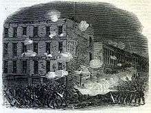 Discontent with the 1863 draft law led to riots in several cities and in rural areas as well. By far the most important were the New York City draft riots of July 13 to July 16, 1863.[47] Irish Catholic and other workers fought police, militia and regular army units until the Army used artillery to sweep the streets. Initially focused on the draft, the protests quickly expanded into violent attacks on blacks in New York City, with many killed on the streets.[48]