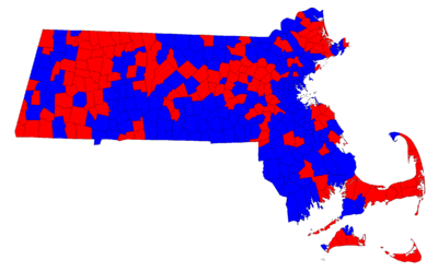 | Results by town. Red indicates towns carried by Josiah Spaulding, blue indicates towns carried by Ted Kennedy. |